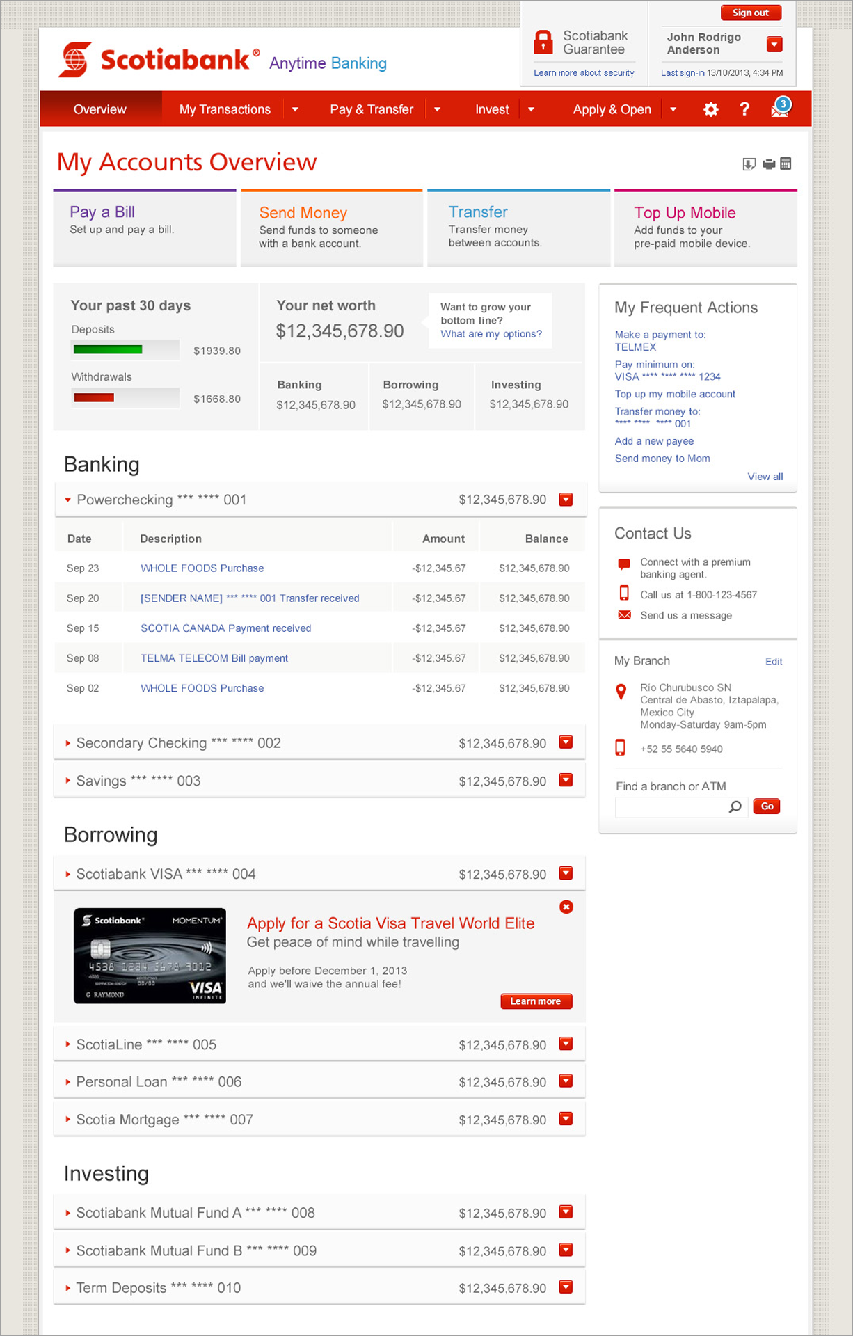 Desktop Interfaces have been designed for the Canada Customers website (En/Fn) and Mexico Retail Customers website in English and Spanish. Through this desktop website, customer would be able to do all their transactions online and learn more about the products and services Scotiabank Mexico website, has to offert.